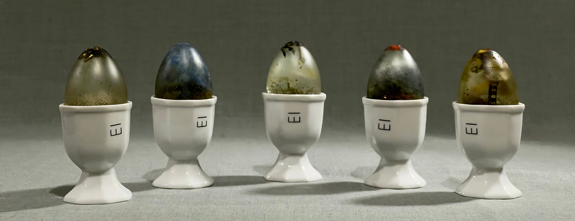Portahuevos cerámicos –herencia familiar–, resina, objetos personales de Ana y Walter.
